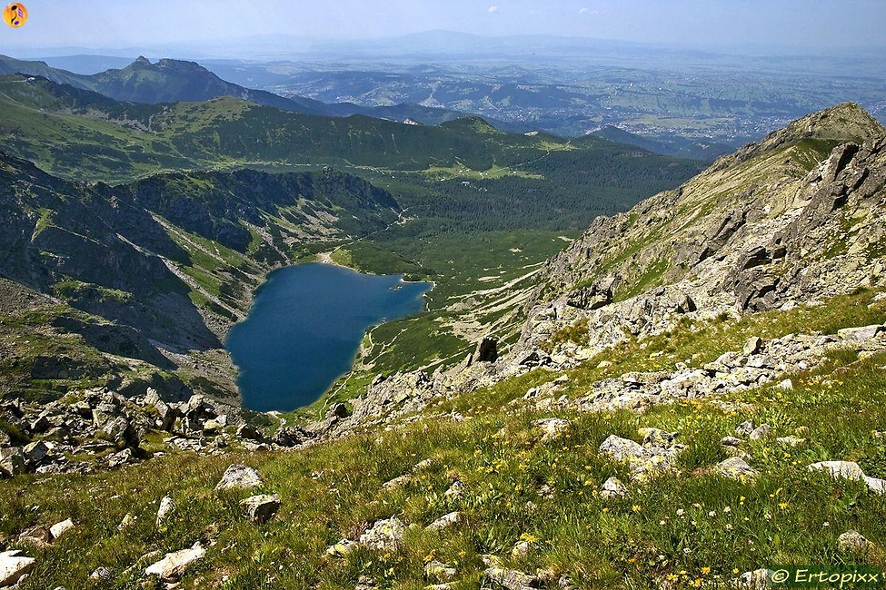 „Widać, jak na przestrzeni kilkuset metrów zbiega łagodnie w dół, a gdzieś niżej, gdzie żleb się kończy - błyszczy tafla Czarnego Stawu. Biada jednak turyście, który by zaufał tej drodze i począł nią schodzić. Początkowo istotnie nie napotka żadnych trudności, potem już nieco gorzej, ale wciąż jeszcze będzie mu się dobrze schodziło poprzez niewielkie progi skalne, oddzielające od siebie połogie części trawiasto-piarżystego żlebu. Wreszcie żleb zaczyna się robić bardzo stromy, a na koniec urywa się olbrzymim, przewieszonym kominem. Sto osiemdziesiąt metrów niżej widnieją piargi doliny, a dalej - tak bliski; a jednocześnie tak daleki - Czarny Staw”